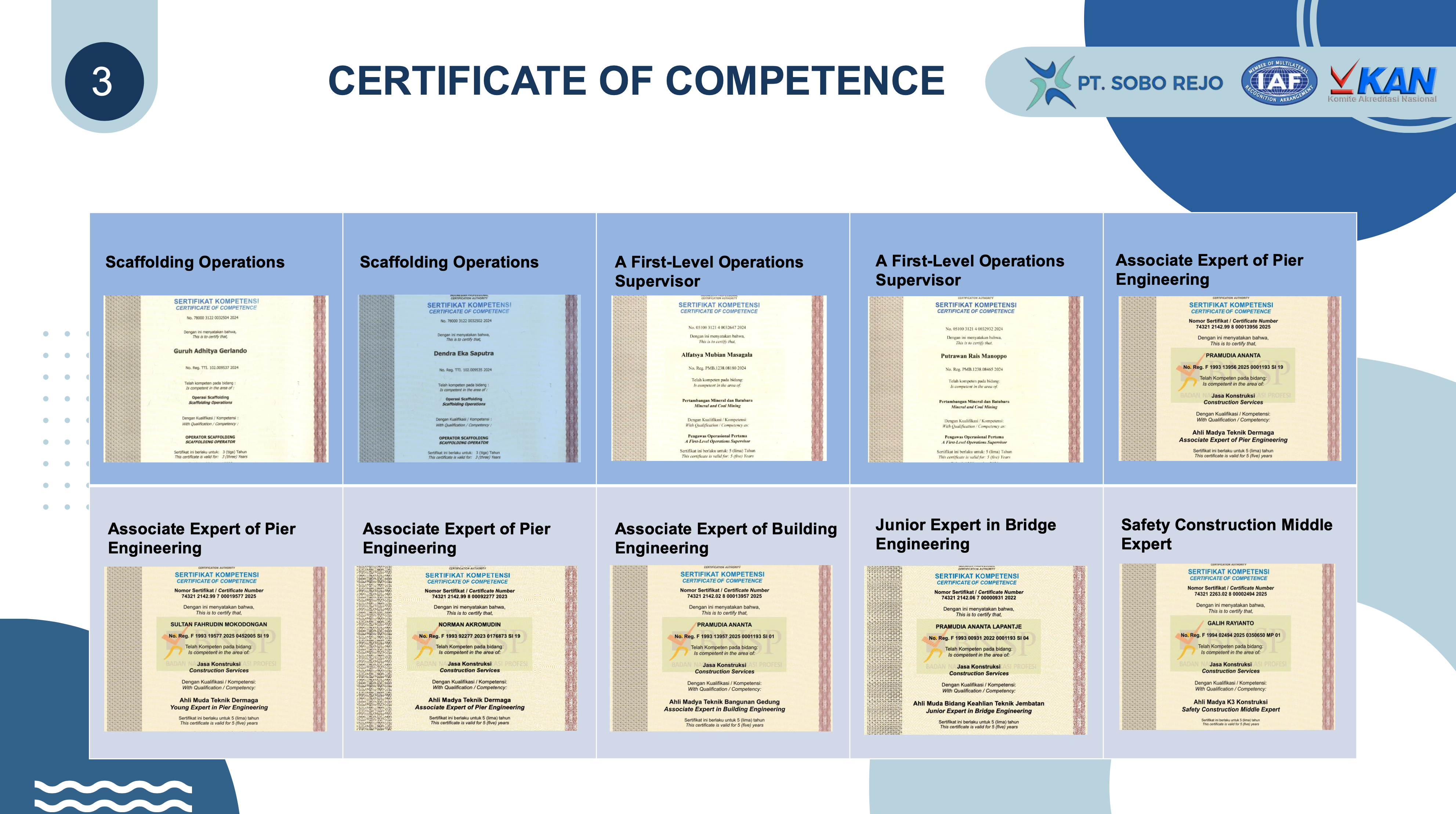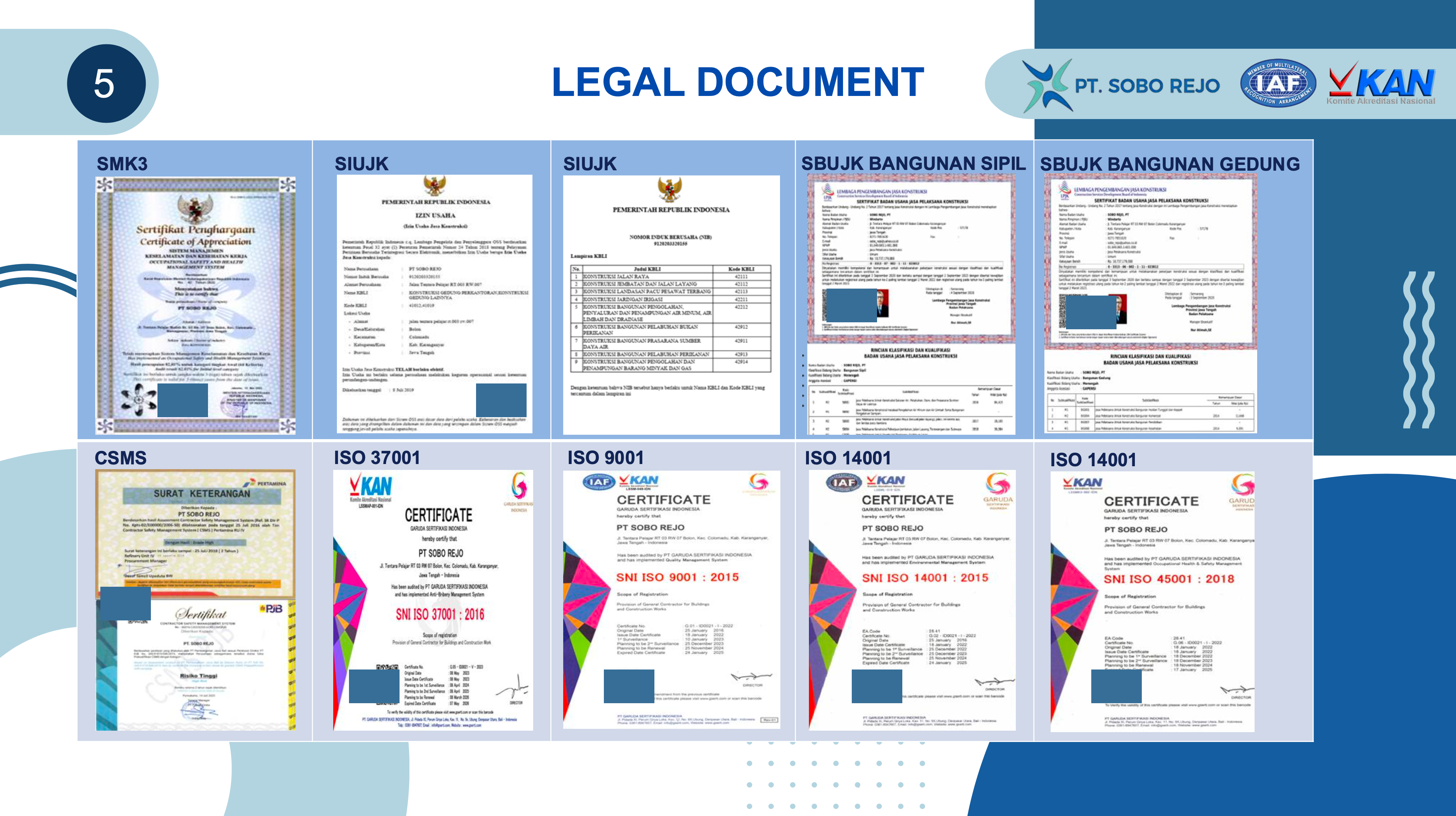 PT. Sobo Rejo is a General Contractor that has been part of Indonesian infrastructure development. Our more than twenty year-long experience of excellence has built a good record of integrity, expertise and customer satisfaction in Indonesia construction industry. Founded as CV Sobo Rejo in April 1997, CV Sobo Rejo grew into PT Sobo Rejo in November 2005. For more than 20 years, our experts and engineers have been building roads, bridges, office buildings, massive water storage tanks, river rehabilitation and other public facilities hence establishing our footprints in the country's integrated development for a better living to society.